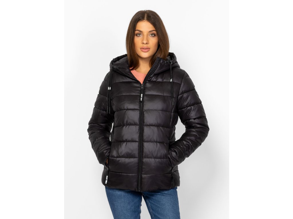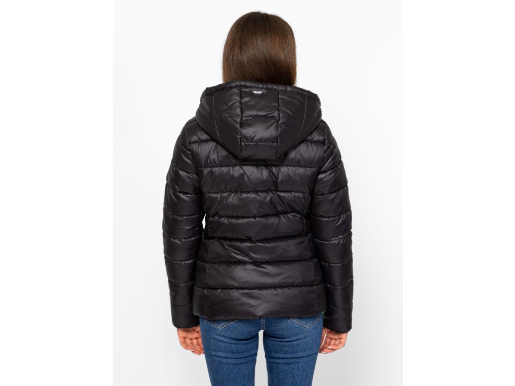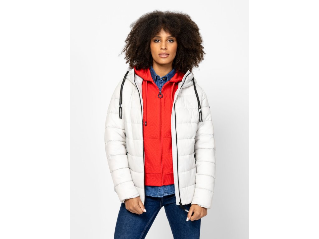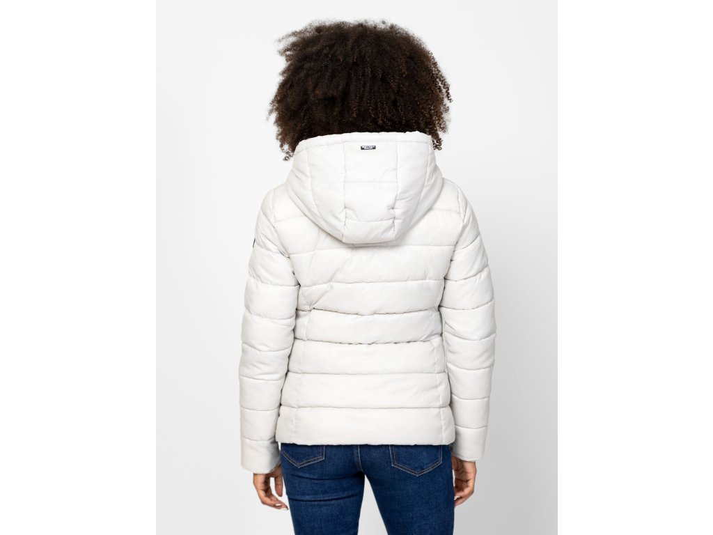 Dámská lehká prošívaná bunda s pohodlným ženským střihem, nastavitelnou pevnou kapucí, vnitřní légou proti větru, kapsami na zip s přizpůsobeným střihem, malým logem na rukávech, kapuci a boku.
