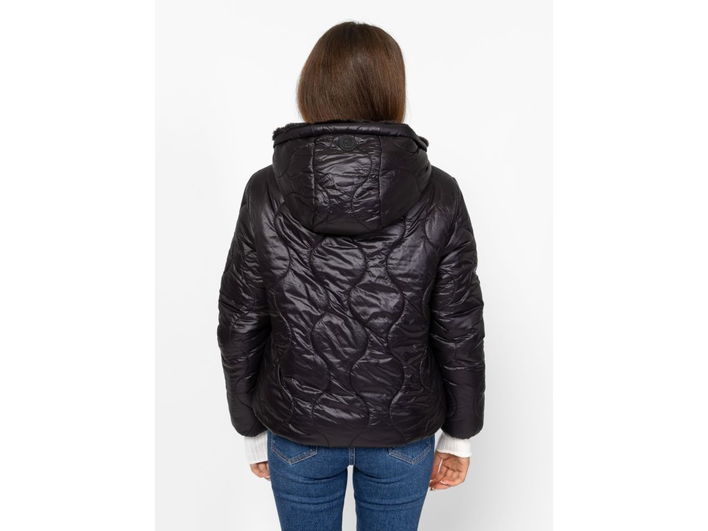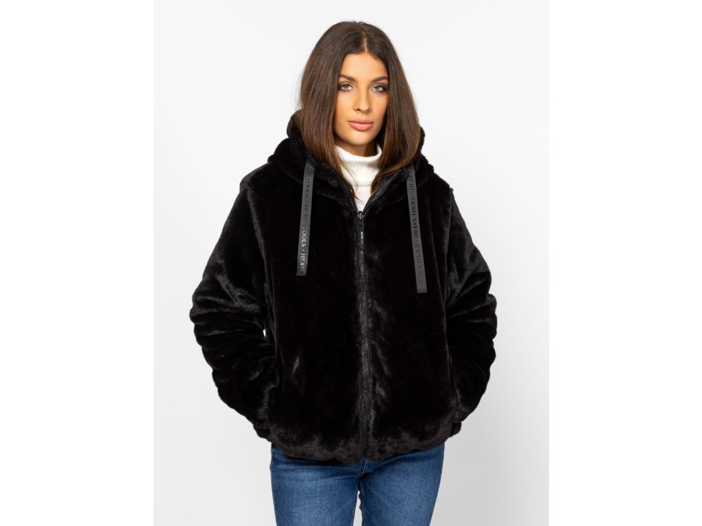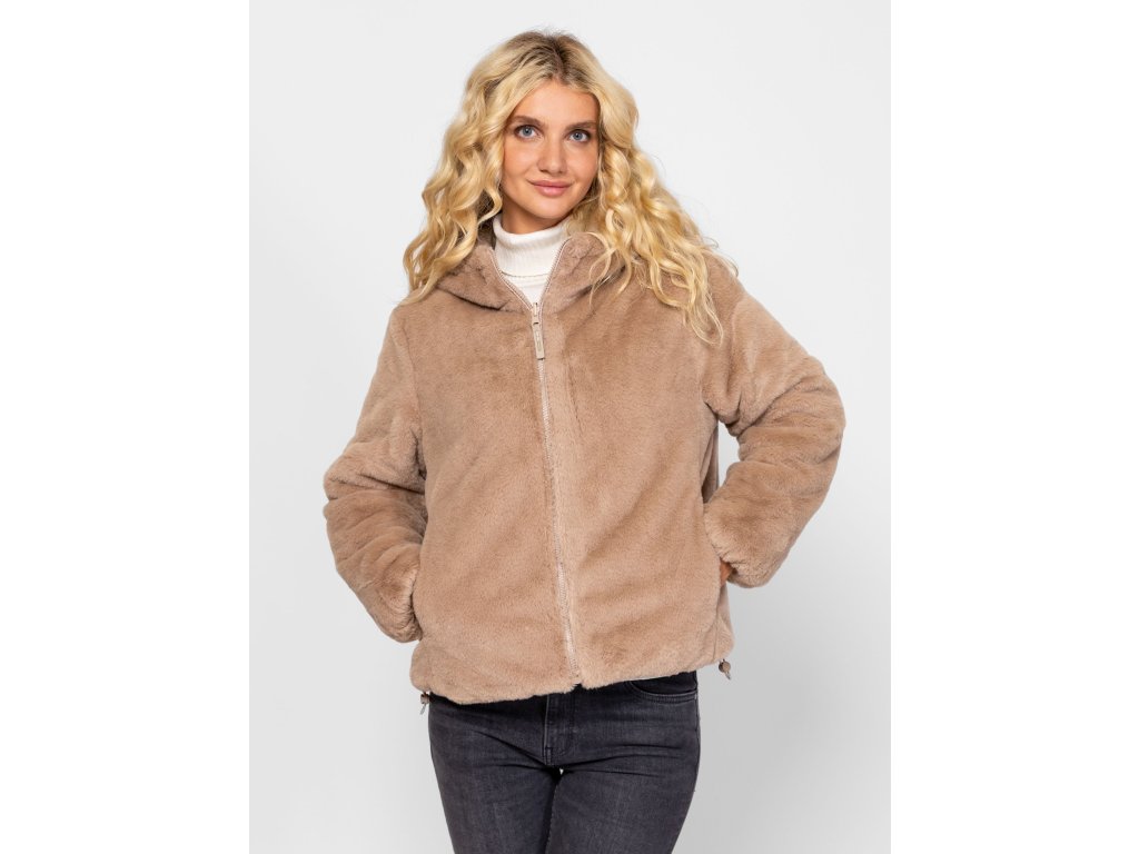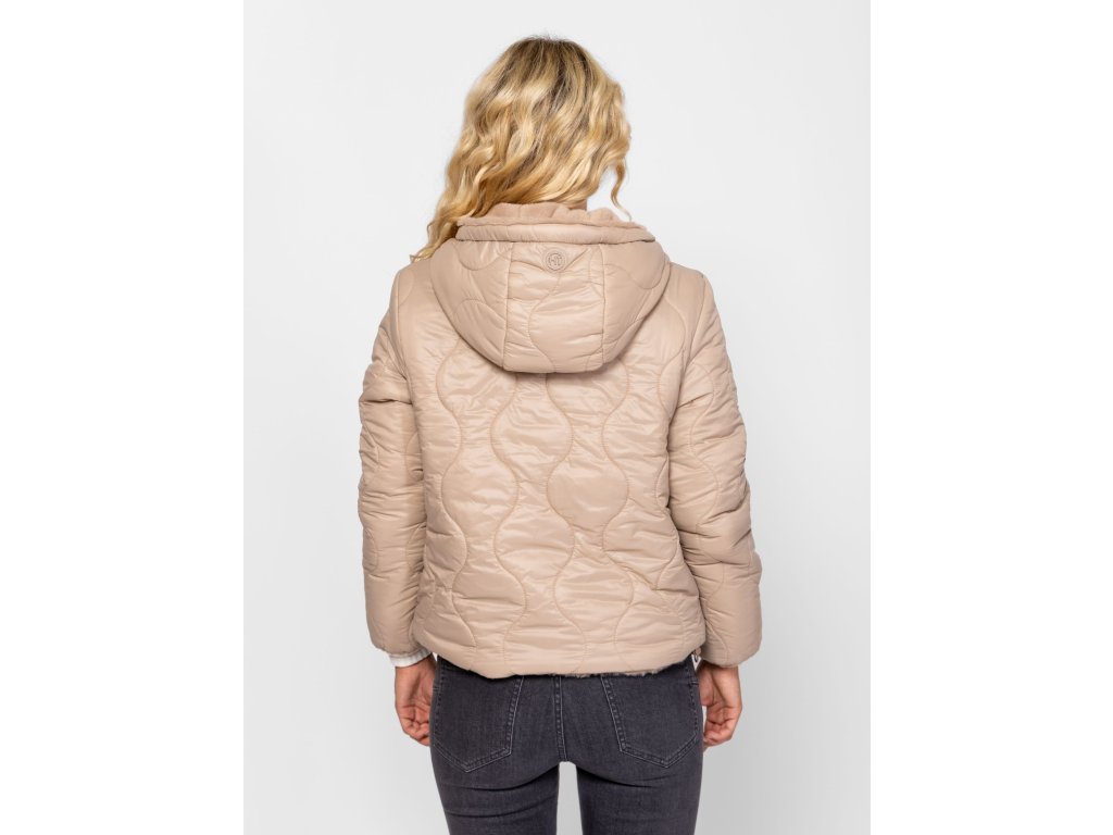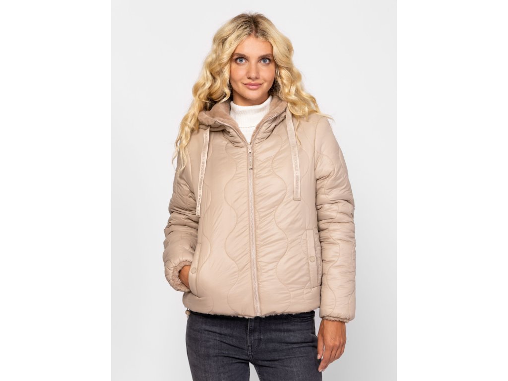 Dámská oboustranná bunda s prošívaným a kožešinovým povrchem, širší střih, nastavitelná pevná kapuce, nastavitelný spodní lem, prošívaná strana s patentovými kapsami, kožešinová strana s lištovými kapsami, malé logo na kapuci.