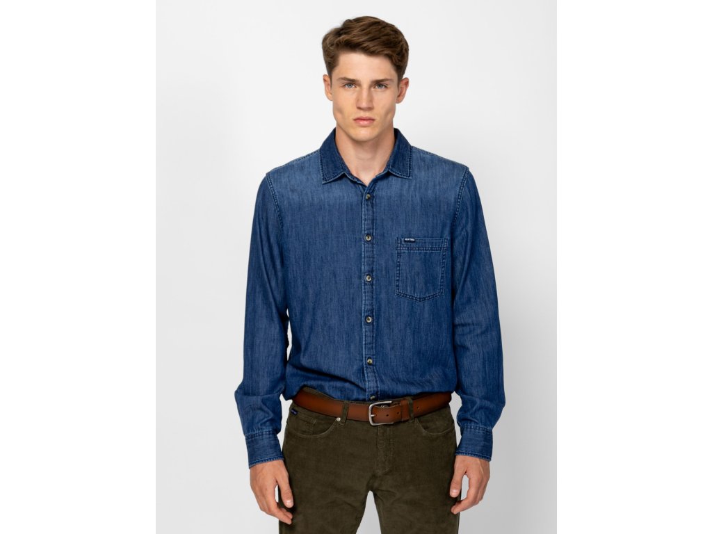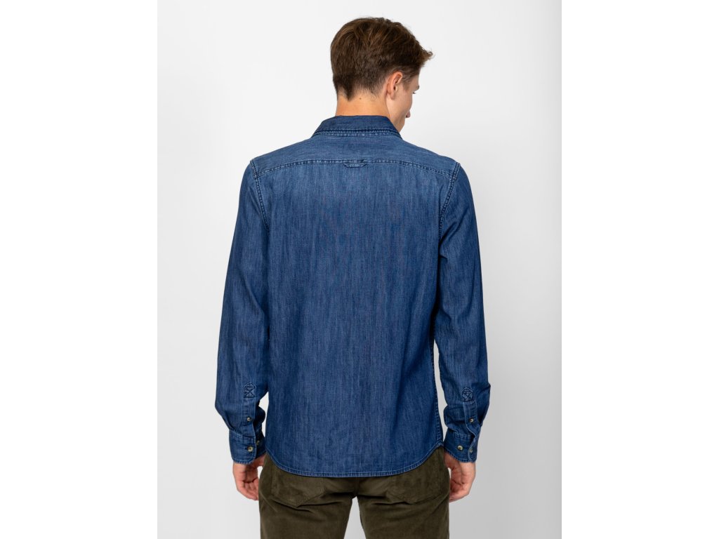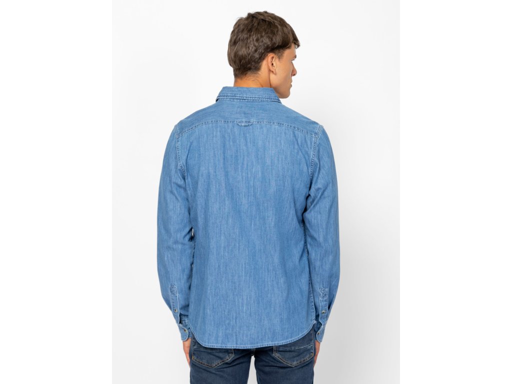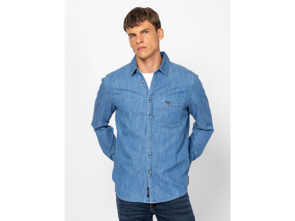 Pánská džínová košile s dlouhým rukávem ve dvou odstínech z čisté bavlny s pohodlným střihem, zapínáním na knoflíky, pečlivě navrženým límcem a manžetami, levým předním kapsou a malým tkaným logem značky na kapse.