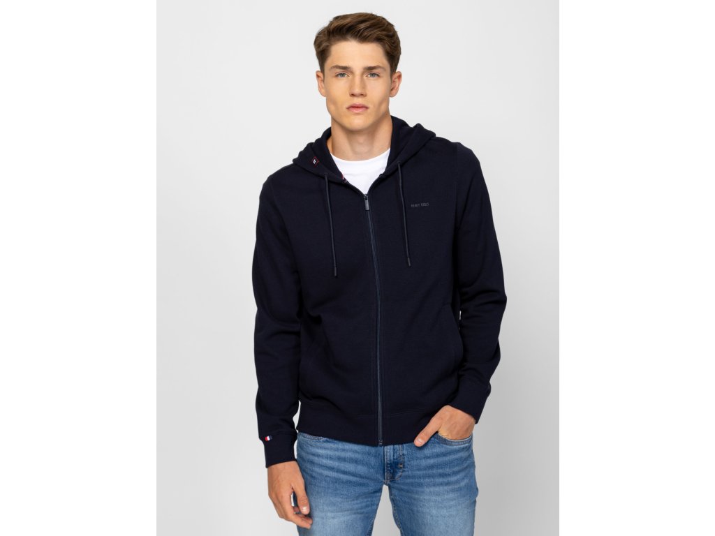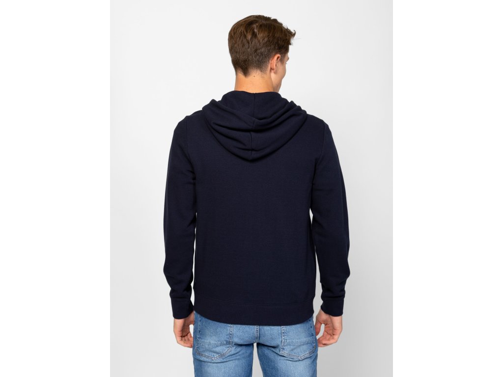 Pánská mikina na zip s klasickým střihem, rovnými kapsami, žebrovaným lemem na spodním okraji a vpředu, a malým logem na přední straně, kapuci, spodní části rukávu a zádech.